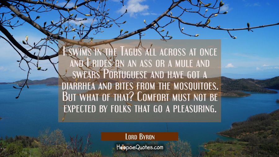 I swims in the Tagus all across at once and I rides on an ass or a mule and swears Portuguese and have got a diarrhea and bites from the mosquitoes. But what of that? Comfort must not be expected by folks that go a pleasuring.