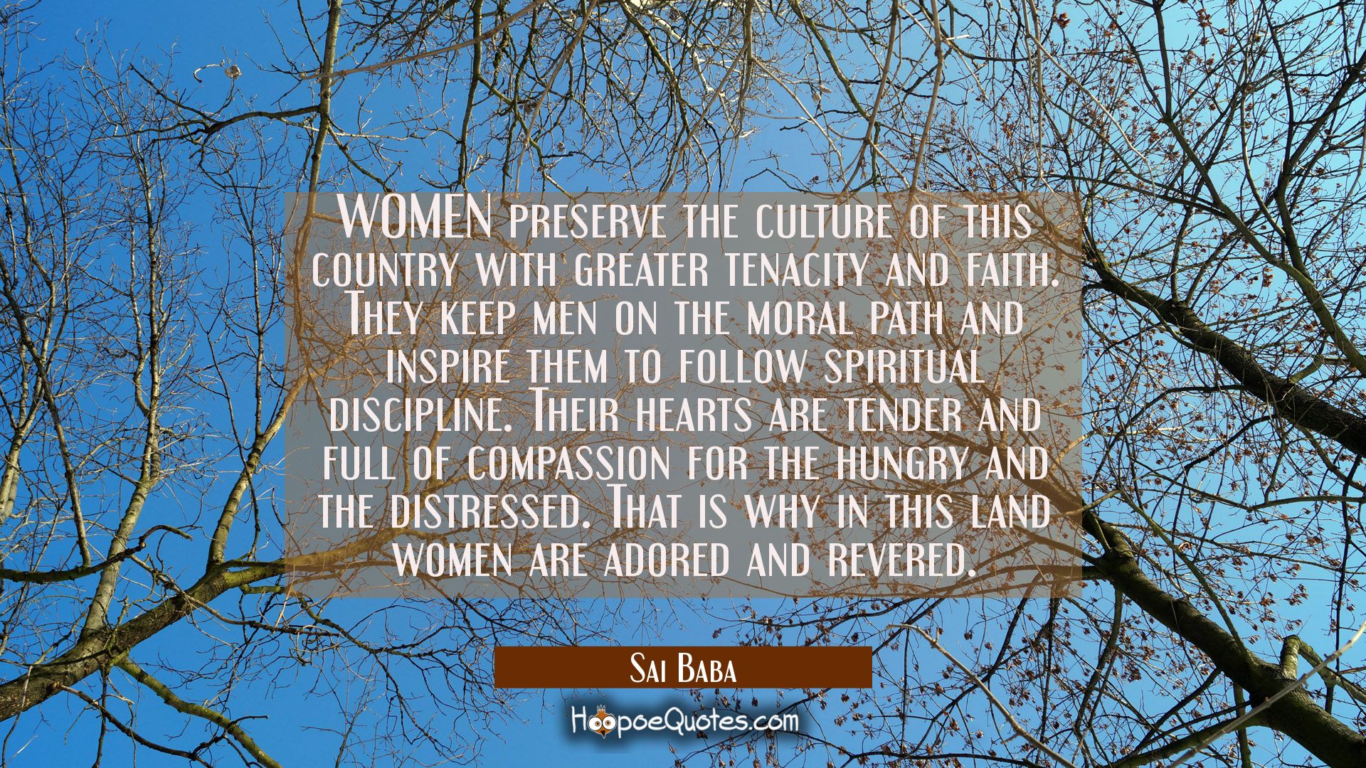 WOMEN preserve the culture of this country with greater tenacity and faith. They keep men on the moral path and inspire them to follow spiritual discipline. Their hearts are tender and full of compassion for the hungry and the distressed. That is why in this land women are adored and revered.