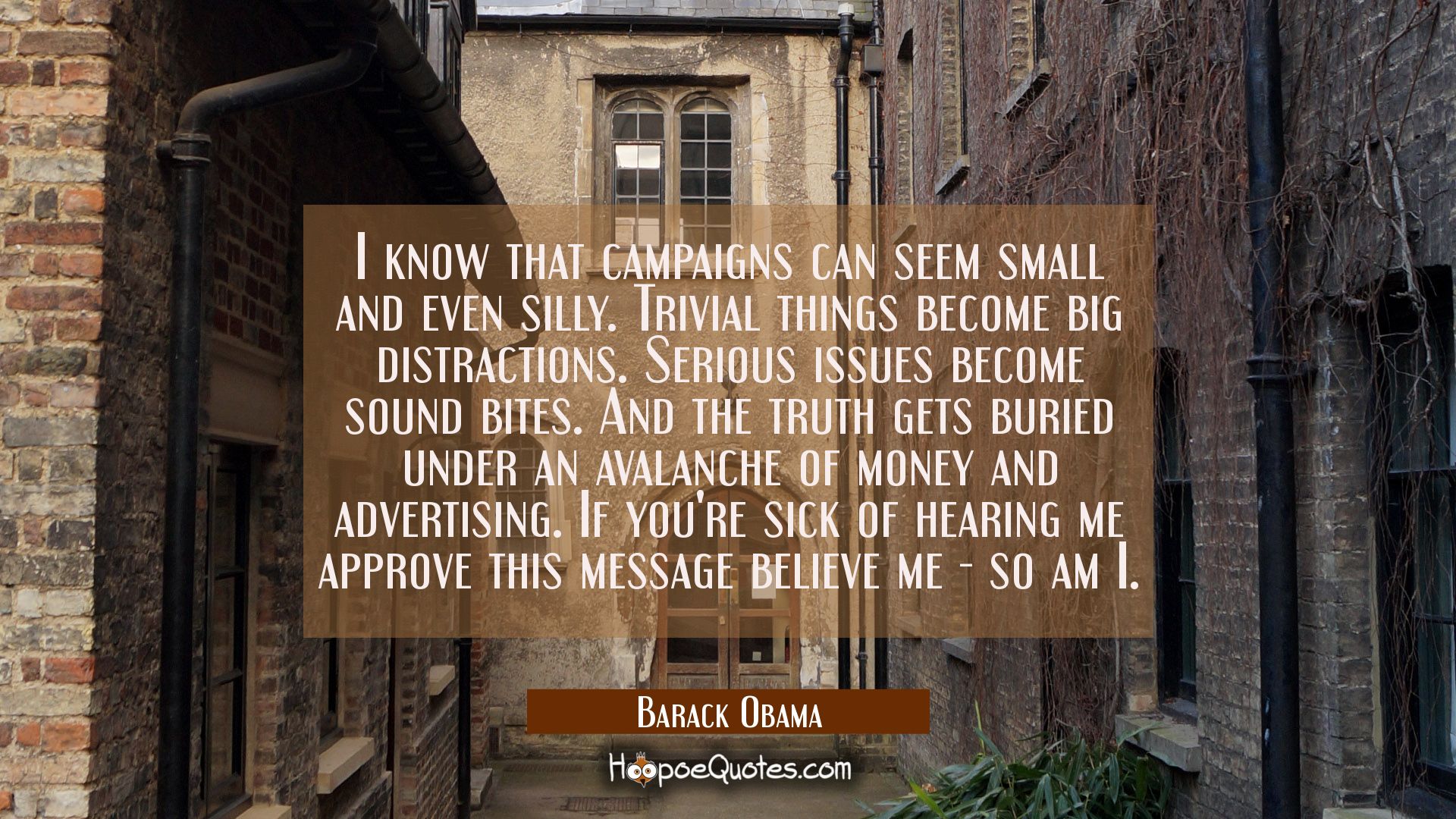 I know that campaigns can seem small and even silly. Trivial things become big distractions. Serious issues become sound bites. And the truth gets buried under an avalanche of money and advertising. If you're sick of hearing me approve this message believe me - so am I.