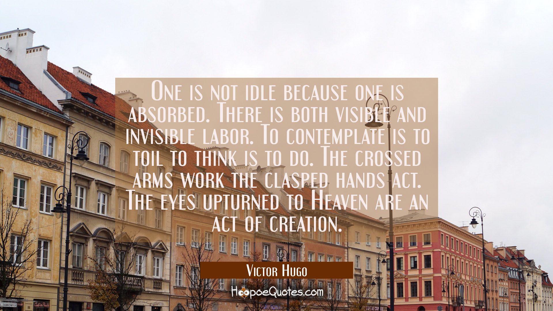 One is not idle because one is absorbed. There is both visible and invisible labor. To contemplate is to toil to think is to do. The crossed arms work the clasped hands act. The eyes upturned to Heaven are an act of creation.