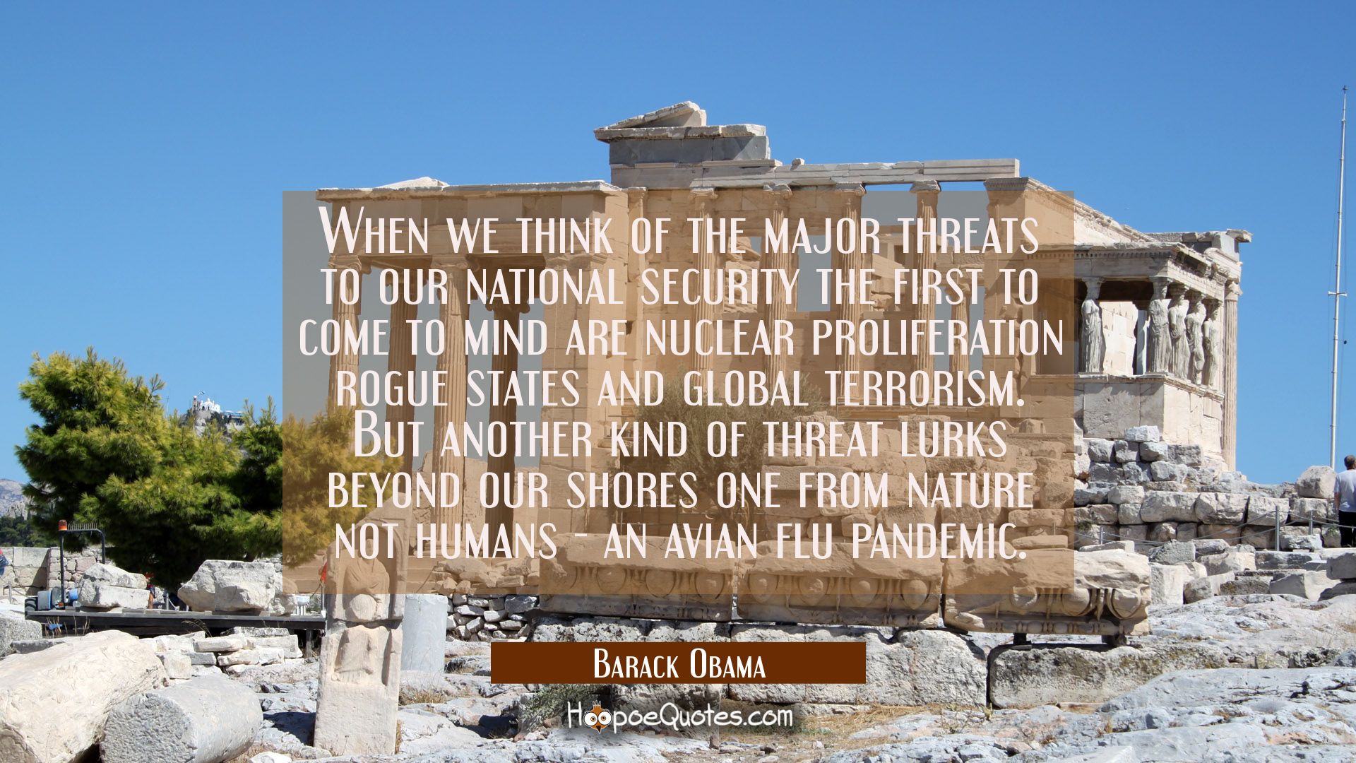 When we think of the major threats to our national security the first to come to mind are nuclear proliferation rogue states and global terrorism. But another kind of threat lurks beyond our shores one from nature not humans - an avian flu pandemic.