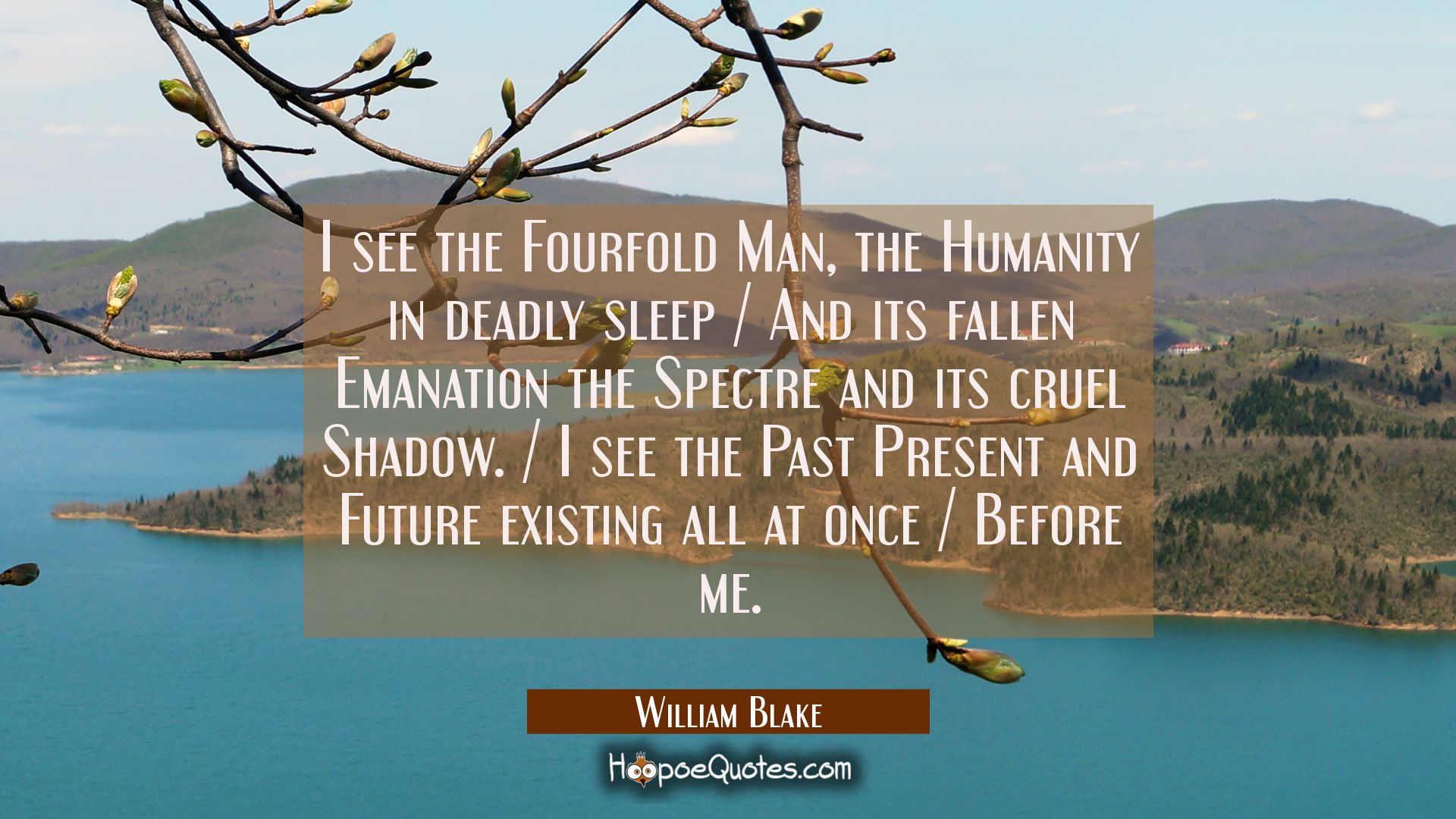 I see the Fourfold Man, the Humanity in deadly sleep / And its fallen Emanation the Spectre and its cruel Shadow. / I see the Past Present and Future existing all at once / Before me.
