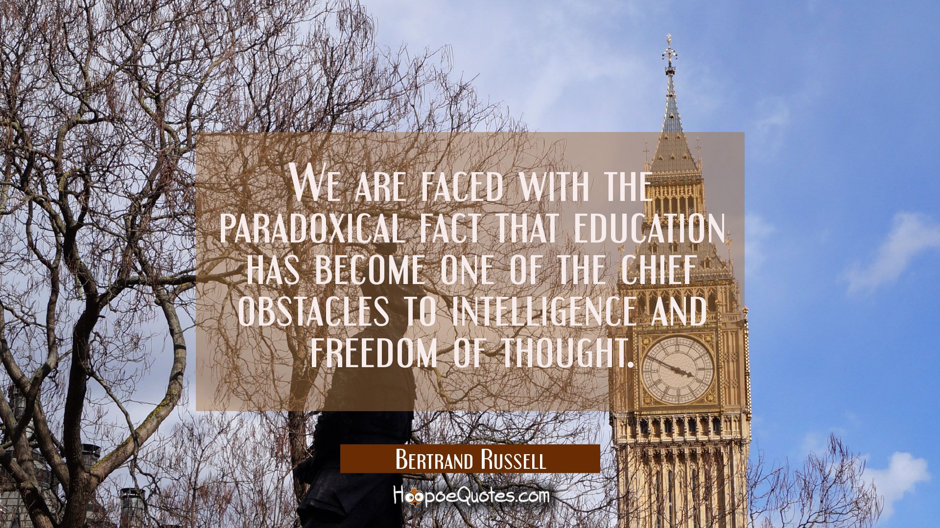 We are faced with the paradoxical fact that education has become one of the chief obstacles to intelligence and freedom of thought.