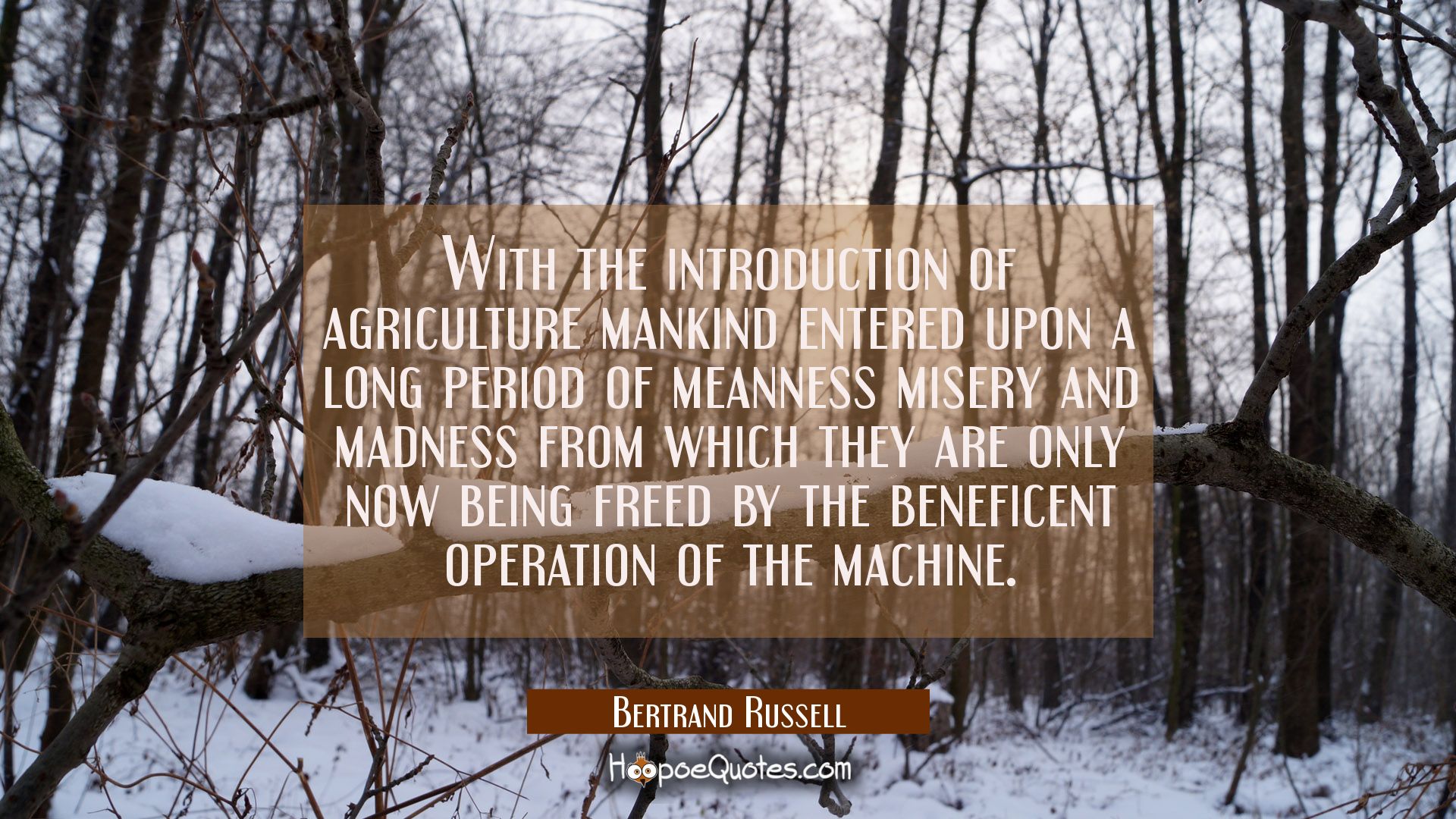 With the introduction of agriculture mankind entered upon a long period of meanness misery and madness from which they are only now being freed by the beneficent operation of the machine.