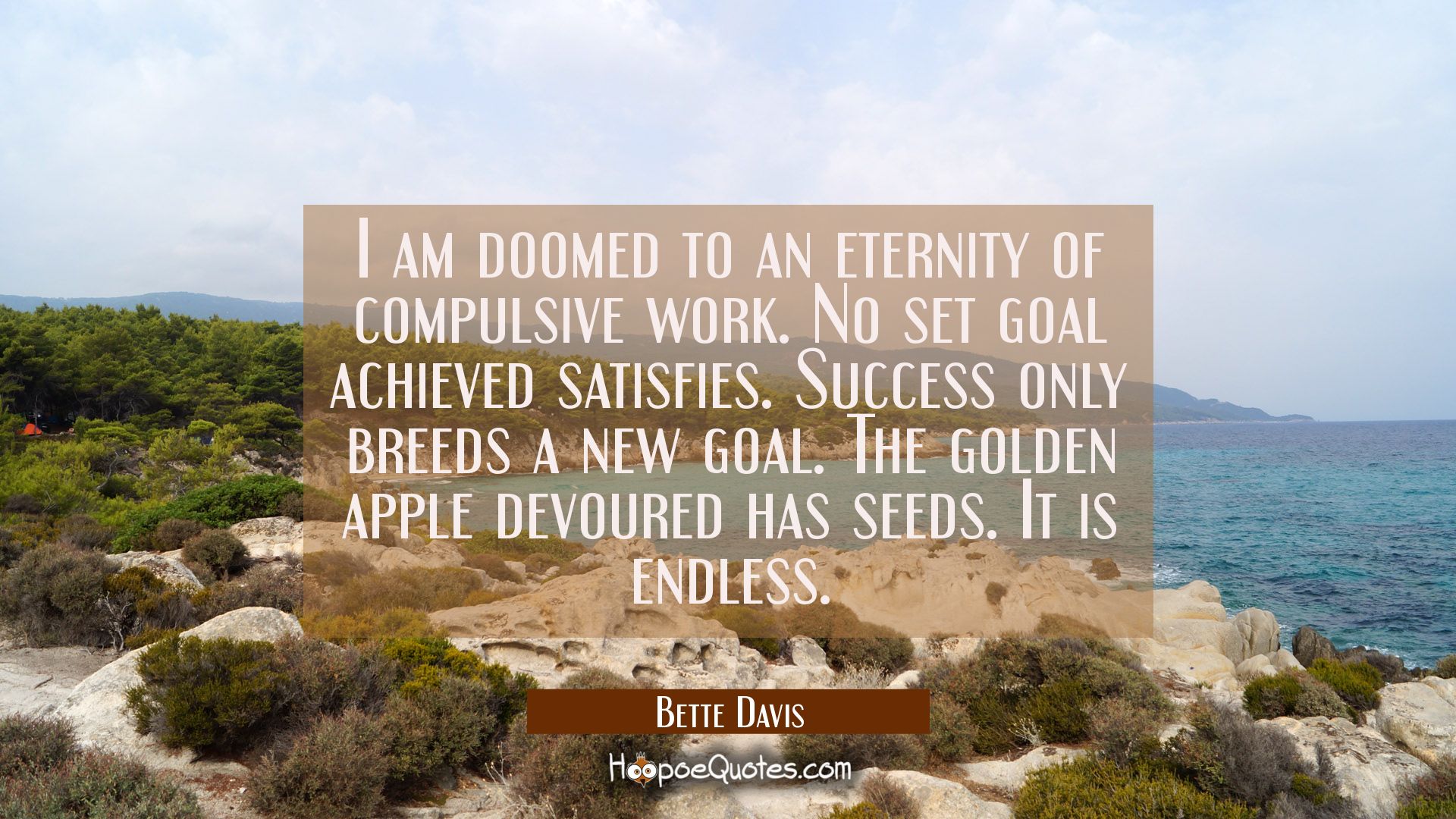 I am doomed to an eternity of compulsive work. No set goal achieved satisfies. Success only breeds a new goal. The golden apple devoured has seeds. It is endless.